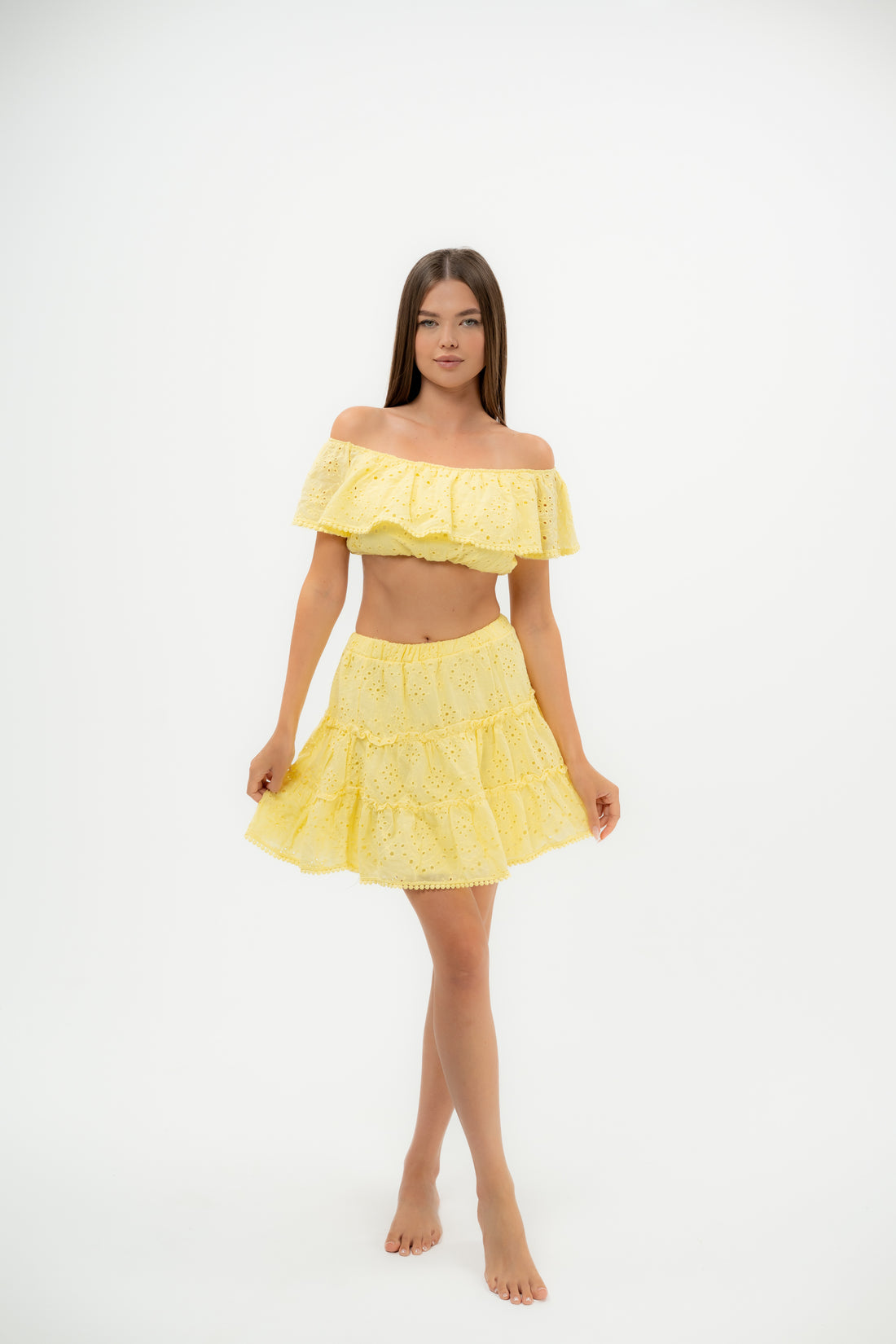Sunshine Ruffle Set (Two-piece set in soft yellow eyelet fabric, featuring an off-shoulder ruffle crop...