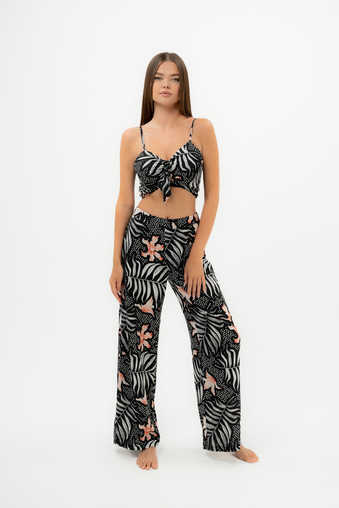 Jungle Noir Set (A striking two-piece set with a knotted crop top and wide-leg pants,...