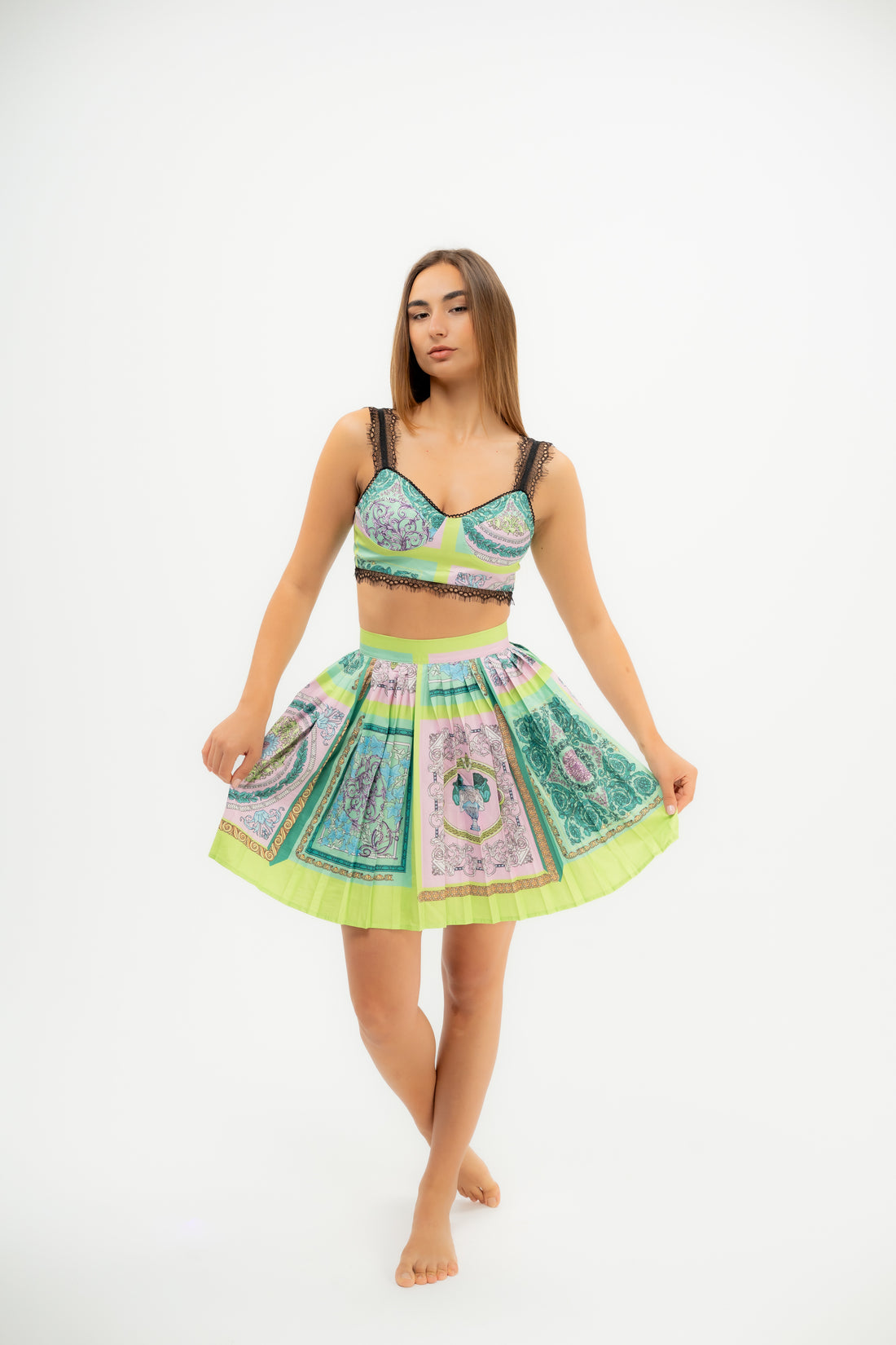 Verde Charm Co-ord Set(A vibrant two-piece set featuring a lace-trimmed crop top and a pleated...