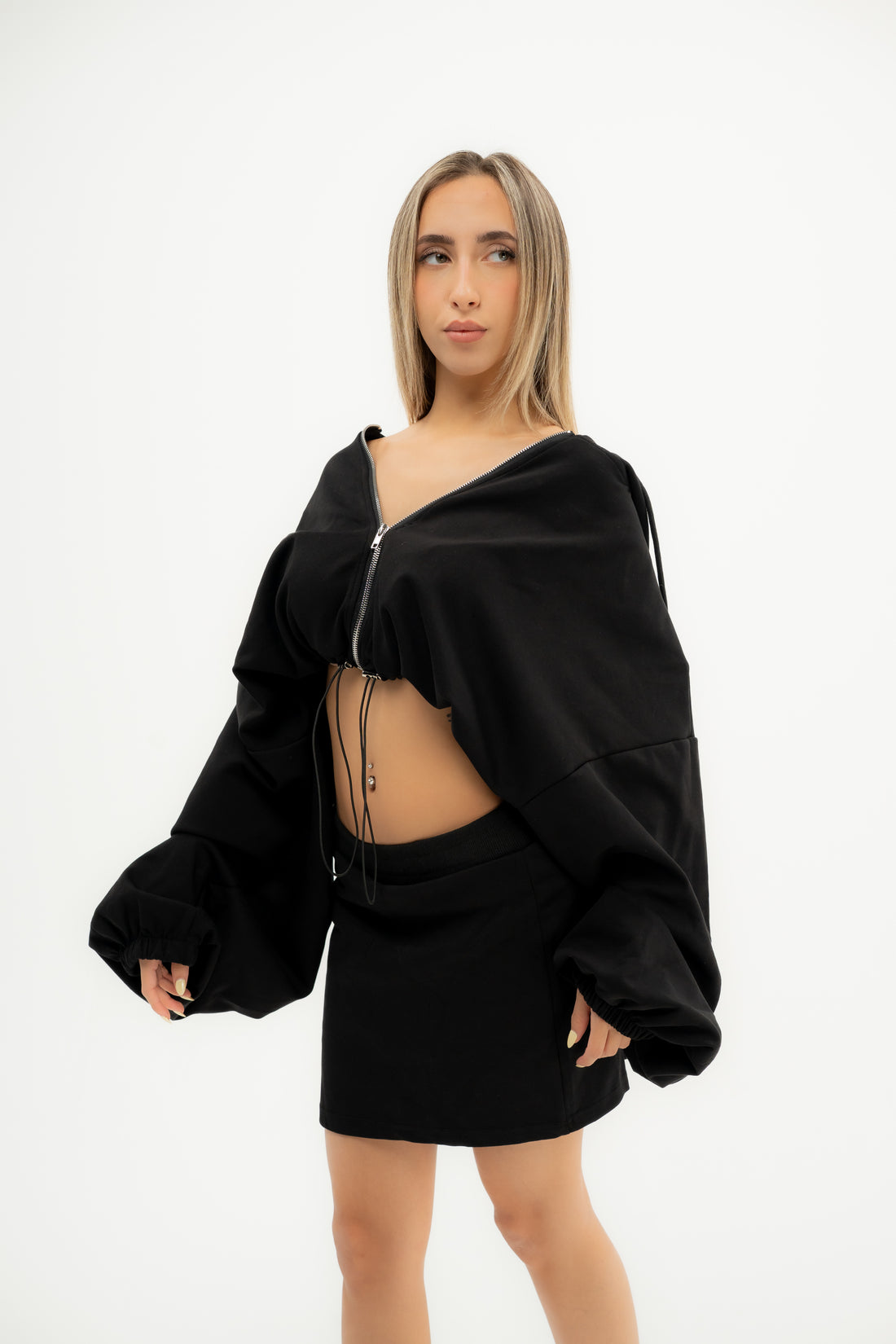 Noir Rebel Set(A bold black co-ord featuring an exaggerated cropped jacket with statement sleeves and...