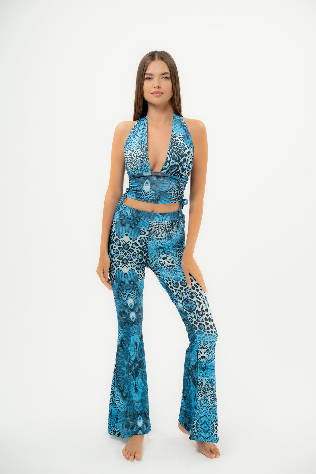 Blue Mirage Set (Striking halter top with matching flares in hypnotic blue prints, designed to...
