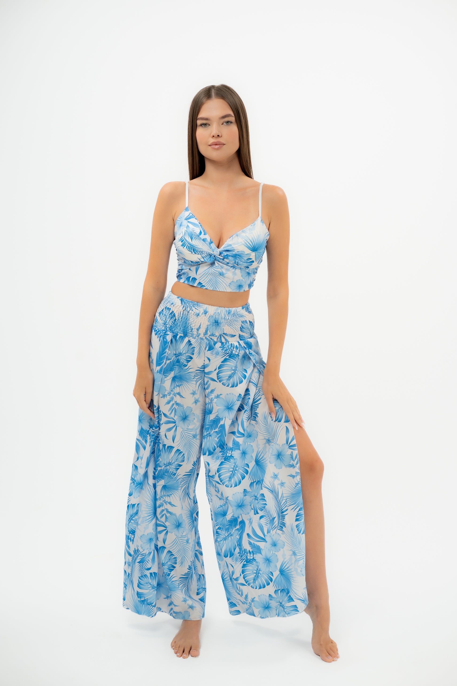Blue Lagoon Set (Escape to paradise in the Blue Lagoon Set. Designed with a twist-front crop top and flowy high-slit wide-leg pants, this set is adorned with a tropical leaf and floral print in refreshing shades of blue and white. Light, breezy, and effortlessly chic, it’s the ultimate look for resort wear, seaside dinners, or sunny summer days.)