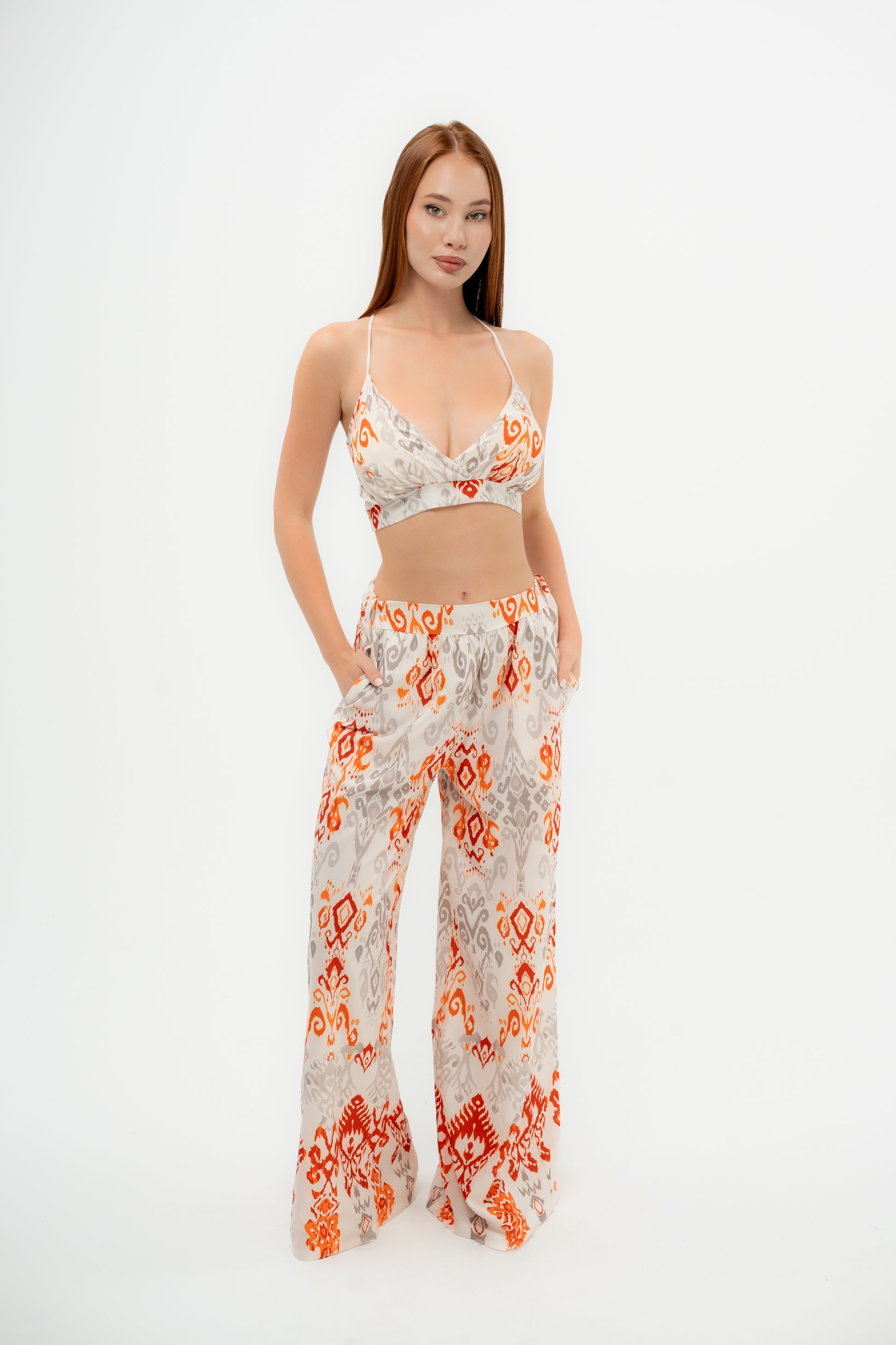 The Sunset Vibes Set (A breezy two-piece featuring a strappy crop top and wide-leg pants with a bold orange and grey print. perfect for summer days and beachy nights.)