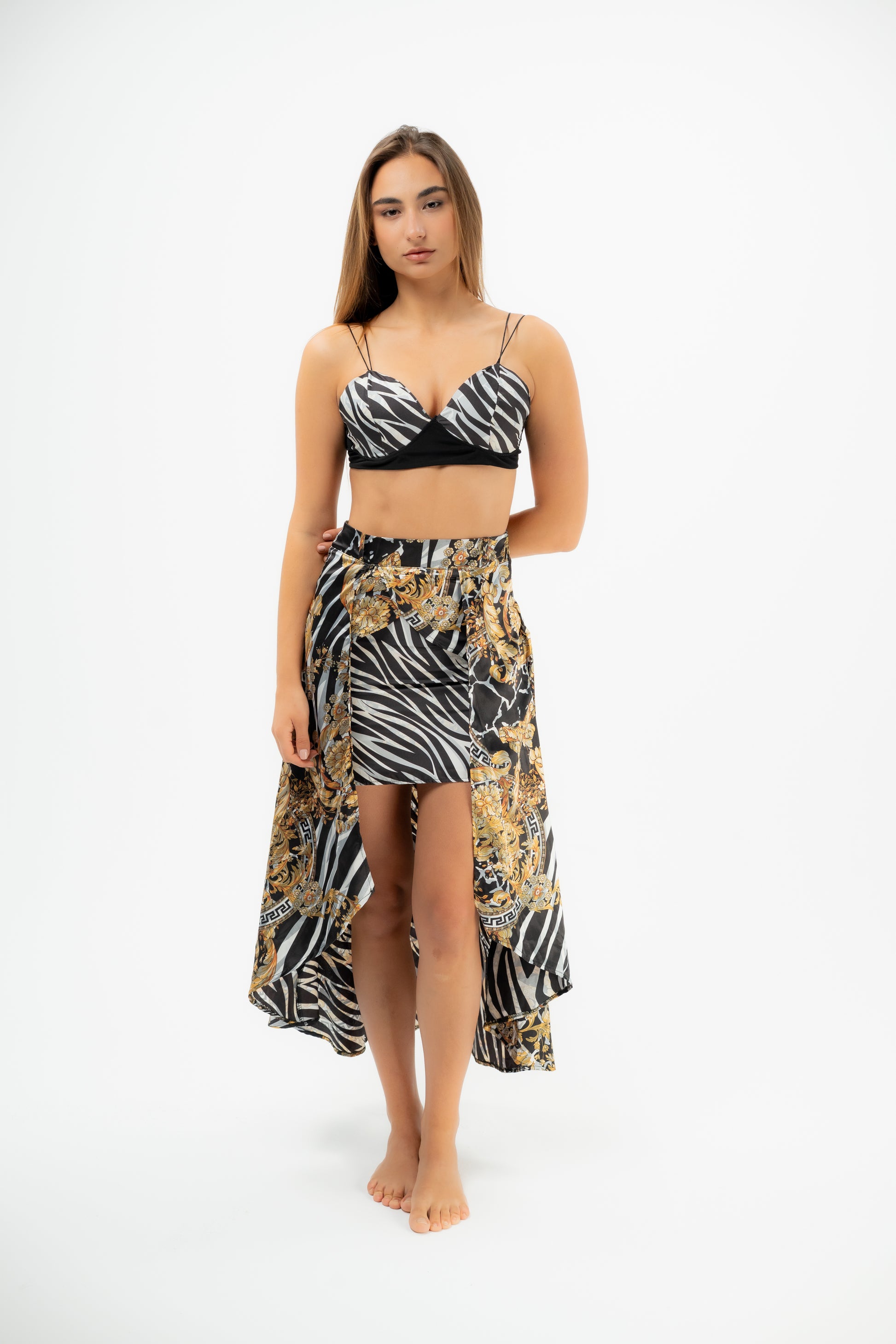 Jungle Royale Set (Statement co-ord pairing a zebra-striped crop top with a baroque-detailed high-low skirt, blending wild energy with regal flair.)