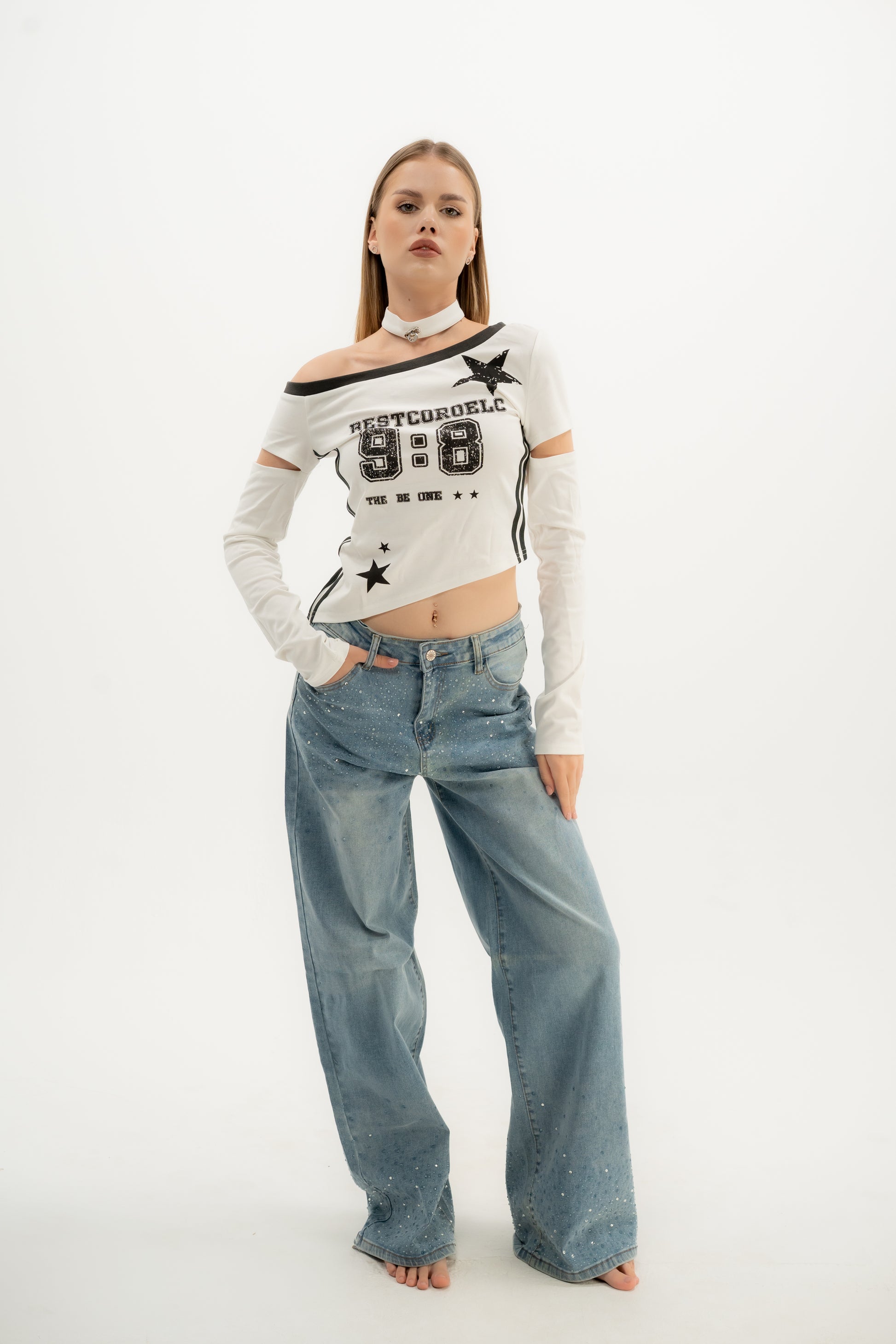 Star Striker Crop (A white off-shoulder crop top with bold black graphics, star accents, and cut-out sleeve details that bring a sporty edge with a touch of attitude.)