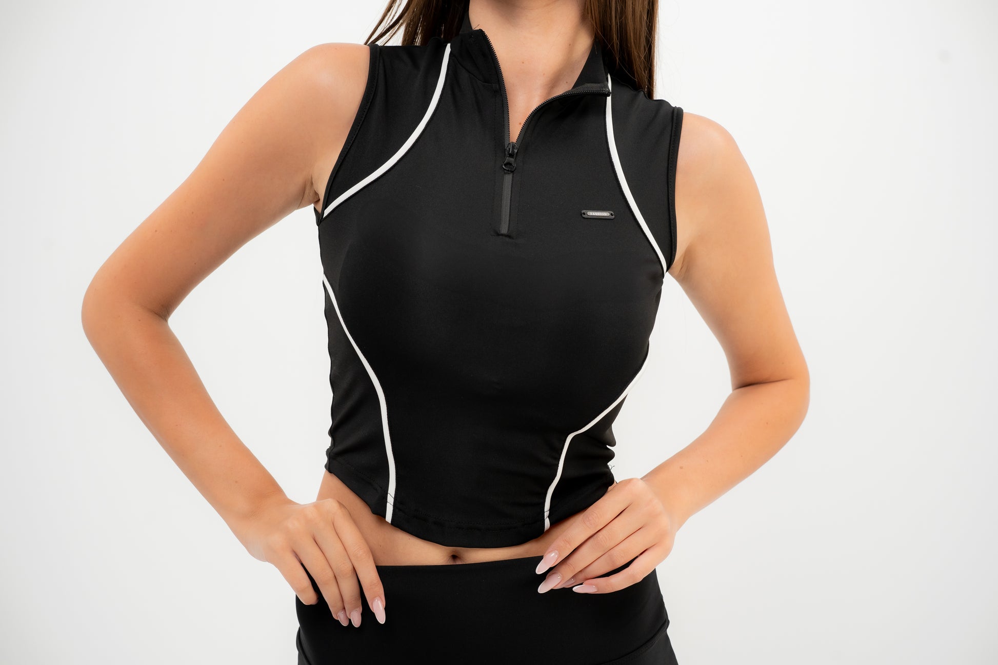 Power Move Tank (A fitted black sleeveless top with a high neckline and half-zip closure for versatile styling. The contrast white piping adds definition and a sporty edge, while the stretchy performance fabric hugs the body for maximum comfort and movement.